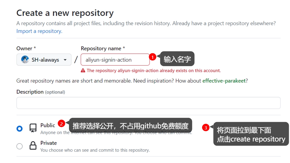 1,进入github创建一个新的仓库,命名aliyun-signin-action