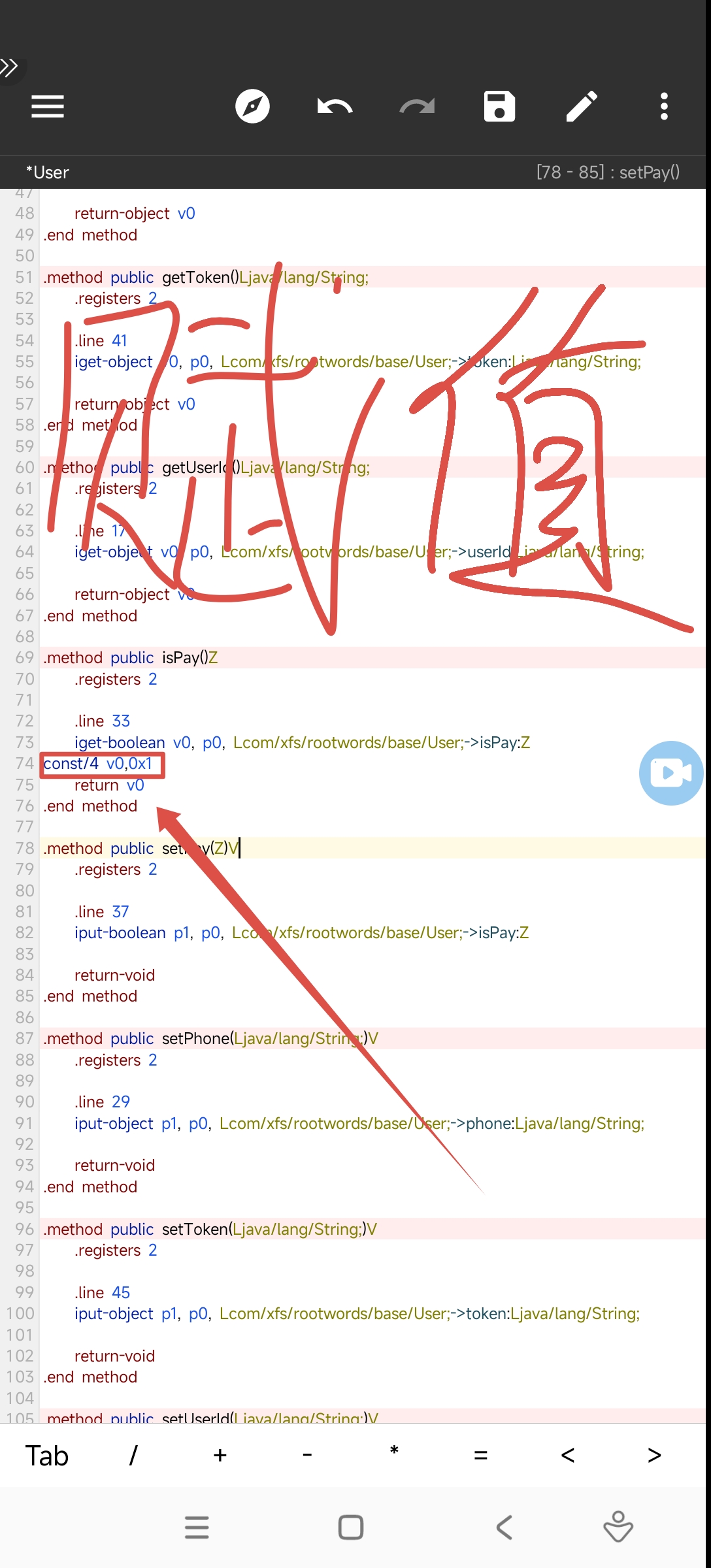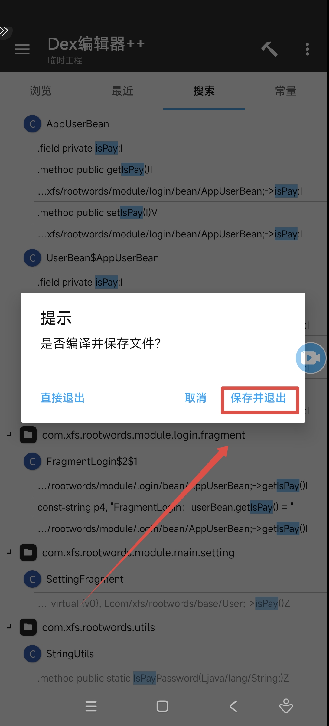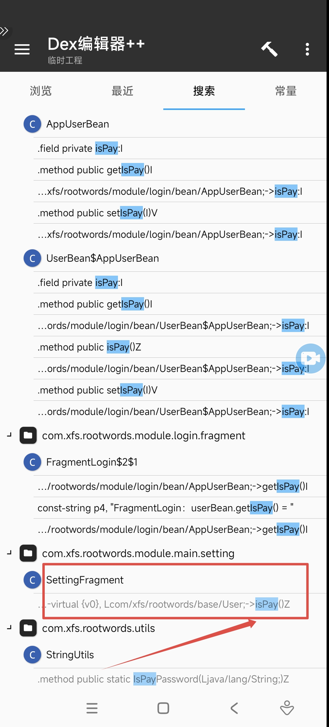 (操作顺序:同上,P11-P15,选择SettingFragment下的ispay()z——长按跳转——找到对应的ispay()z下的return v0前赋值)